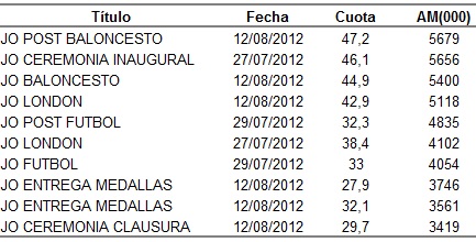 LAS DIEZ EMISIONES MÁS VISTAS DE LOS JJOO DE LONDRES 2012