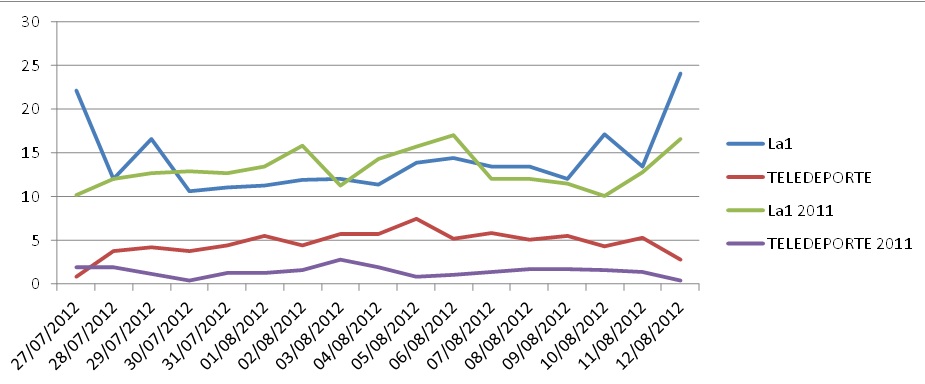 Los datos facilitados Barlovento en función a las cifras de Kantar Media indican que durante todos los días que se emitieron los Juegos Olímpicos de Londres 2012 –entre el 27 de julio y el 12 de agosto La 1 de TVE registró una media de 14,2% de share. El dato es positivo, pero es apenas superior en un punto al registro obtenido durante las mismas fechas del año pasado cuando fue de 13,2%. Si consideramos que TVE no emite publicidad lo que la rentabilidad comercial del evento ha sido nula el único barómetro para medir su éxito se encuentra en las audiencias.