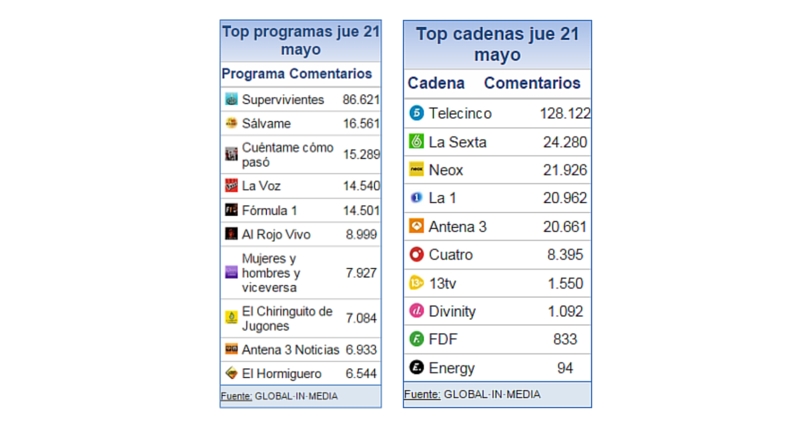 Siguiendo a los náufragos de Honduras, el programa Sálvame alcanzó las 16.661 menciones en la tarde de ayer, donde se anunció una de las noticias de la semana: Raquel Bollo se enfrentará al polígrafo esta noche en Sálvame Deluxe. Por otro lado, el cierre de temporada de Cuéntame cómo pasó en TVE registró los 15.289 comentarios.