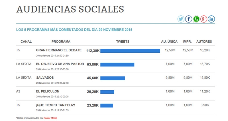 El último domingo de noviembre ha estado marcado por una gran actividad en redes sociales. Así ha quedado reflejado en el ranking de share social de los programas de televisión elaborado diariamente por Kantar Media. La clasificación ha estado liderada por un programa de Telecinco.