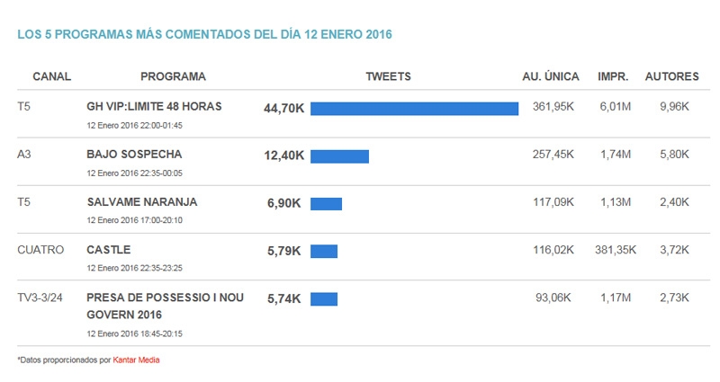 TV3 y su canal temátivo 3/24 se colaron en el top five gracias a la retransmisión de Presa de Possessio i nou Govern 2016. La emisión alcanzó los 5.740 comentarios en redes sociales.