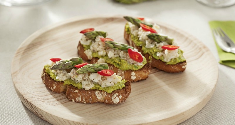 - Para realizar el montaje tuesta las rebanadas de pan y reparte el pesto y el ceviche en el pan tostado. Añade ahora las puntas de espárragos reservadas anteriormente y unas rodajas de guindilla.