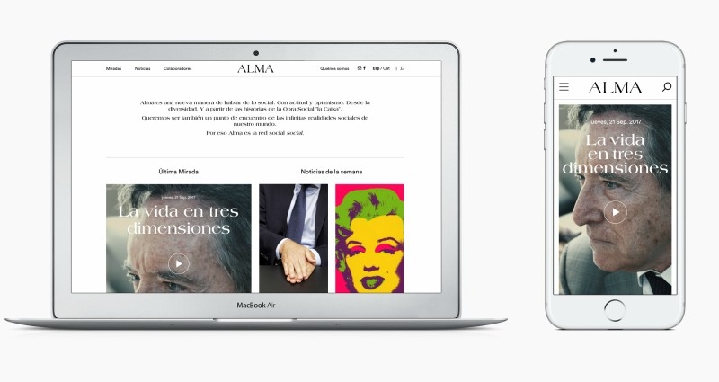 ALMA es una nueva editorial digital que parte de la necesidad de despertar una nueva cultura y una nueva conciencia y tiene como objetivo contar de una manera distinta los proyectos de la Obra Social ”la Caixa”, complementando sus actuales vías de comunicación con un tono cercano y honesto. Nace con la voluntad de ser la red social referente en temas sociales con el fin de generar debate y reflexión para mejorar la sociedad.