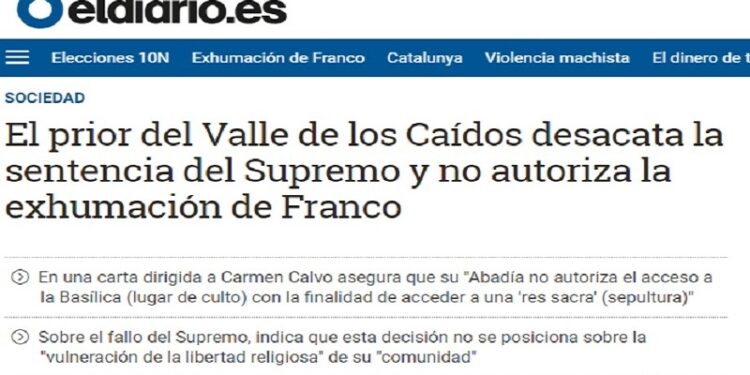 La Abadía Benedictina del Valle de los Caídos ha hecho público un comunicado en el que desmiente al diario.es. El digital que dirige Ignacio Escolar ha publicado en las últimas horas una información en la que titulaba “El prior del Valle de los Caídos desacata la sentencia del Supremo y no autoriza la exhumación de Franco” en la que explicaba como en una carta dirigida a Carmen Calvo, se negaba a la autorización del acceso a la Basílica con la finalidad de acceder a la sepultura.