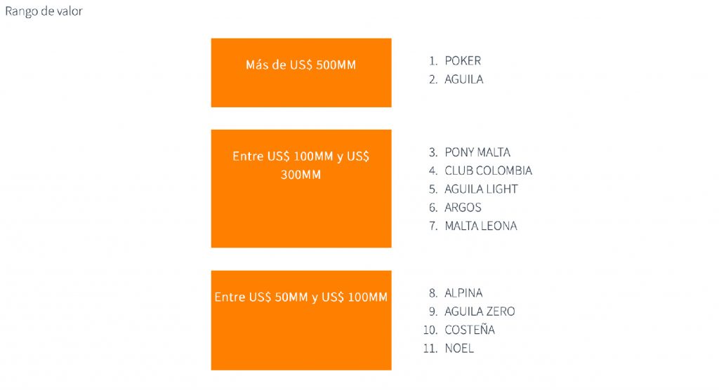 Las marcas de cerveza Poker y Aguila, de Bavaria, continúan encabezando el ranking de los productos superando cada una los US$ 500 millones de dólares.