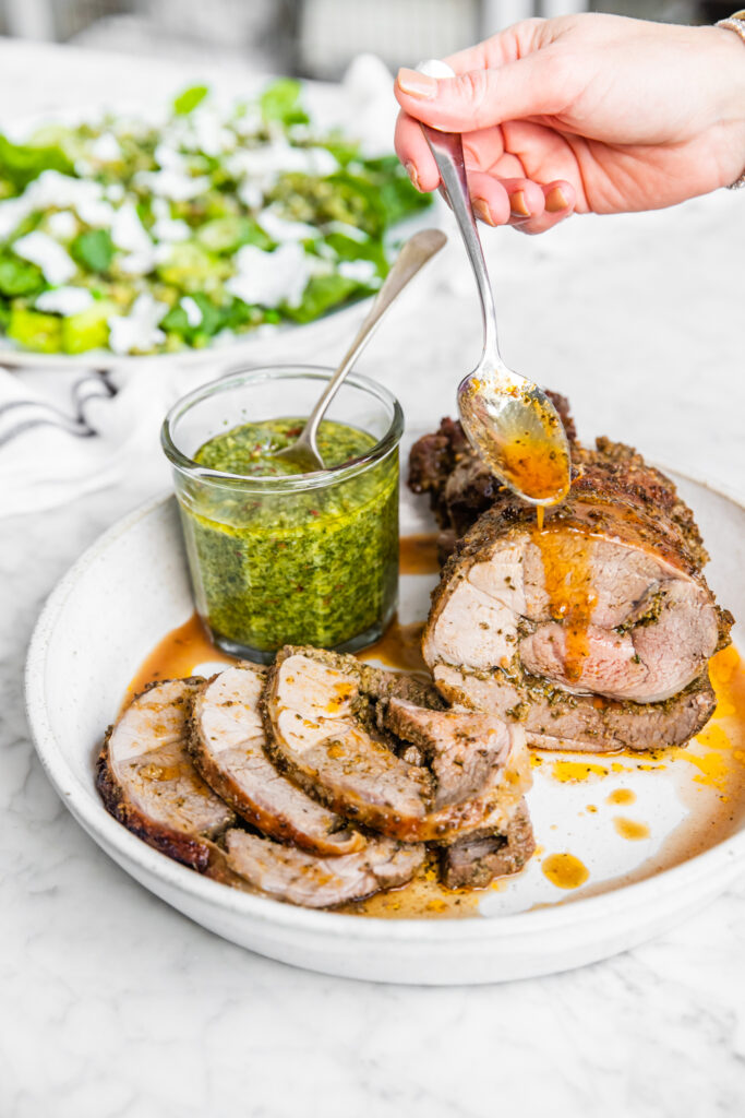 - Colocar el cordero en un bol grande y cubrirlo con la mezcla de hierbas y especias. Mezclarlo bien y dejarlo macerar durante 30 minutos. Colocar el cordero sobre papel de horno y verter el adobo restante del bol sobre la carne. Enrollar sobre sí mismo el cordero desde el extremo más estrecho y atarlo con hilo en secciones de 2 cm.