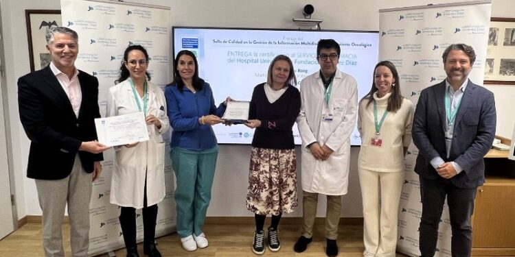 El Servicio de Farmacia Hospitalaria de la Fundación Jiménez Díaz ha recibido el Sello de Calidad en Información al Paciente Oncológico, otorgado por la Fundación de Ciencias del Medicamento y Productos Sanitarios (Fundamed) y avalado por la Sociedad Española de Farmacia Hospitalaria (SEFH), con la colaboración de la Alianza General de Pacientes (AGP), convirtiéndose en el tercer hospital español en acreditarse con esta distinción que acredita el cumplimiento de los estándares de calidad con relación a la información que recibe el paciente.