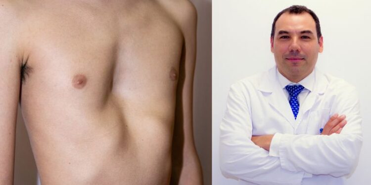 Conocido como pecho hundido o en embudo, tiende a agravarse durante los períodos de crecimiento rápido en la adolescencia. Aunque la causa exacta de esta deformidad es desconocida, se cree que está asociada con un crecimiento anormal del cartílago costal que conduce a una retracción del esternón y las costillas. Según el Dr. Ávila, los síntomas del pectus excavatum dependen de la gravedad de la afectación. En ese sentido, los casos leves, afirma, “pueden ser asintomáticos o presentar síntomas leves, como dolor torácico, algo que ocurre en la mayoría de los casos”. El problema surge desde el punto de vista estético, debido a la deformidad del tórax. “En los casos más severos, los pacientes pueden presentar dificultad para realizar ejercicio físico, dolor torácico o palpitaciones, entre otros”, indica.