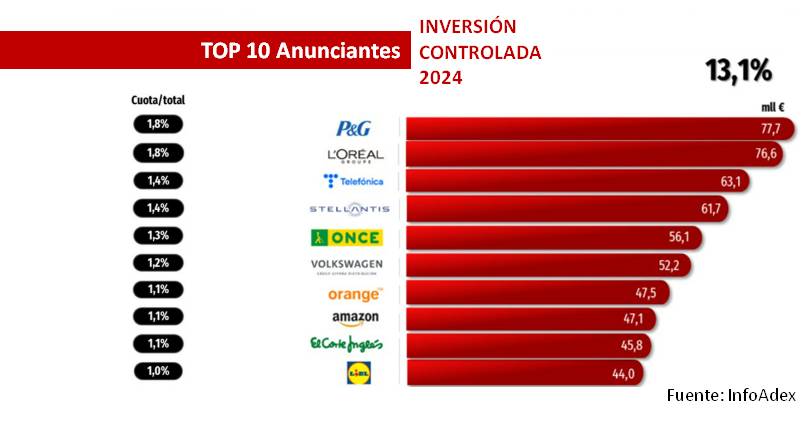 El primer anunciante de 2024 es Procter & Gamble España con una inversión total de 77,7 millones de euros, que supone el 1,8% del total de la inversión publicitaria en medios controlados en España.