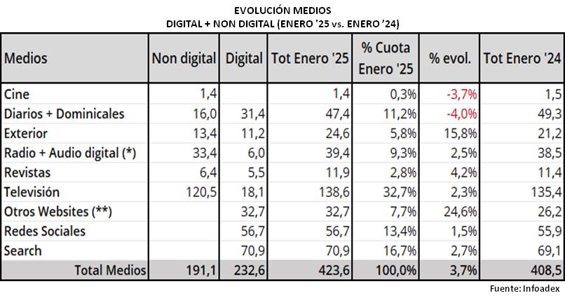 Durante el mes de enero de 2025, la inversión publicitaria ha alcanzado los 423,6 millones de euros, un 3,7% superior que en el periodo equivalente del año anterior cuando el volumen registrado fue de 408,5 millones de euros.
