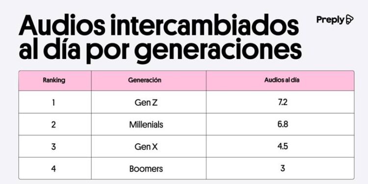 La Gen Z encabeza el uso de este formato, intercambiando una media de 7,2 audios al día, seguida de cerca por los millennials, con 6,8. En contraste, La brecha generacional es evidente, ya que las generaciones seniors parecen inclinarse por otros métodos de comunicación; los X gestionan 4,5, y los boomers, tan solo 3 al día.