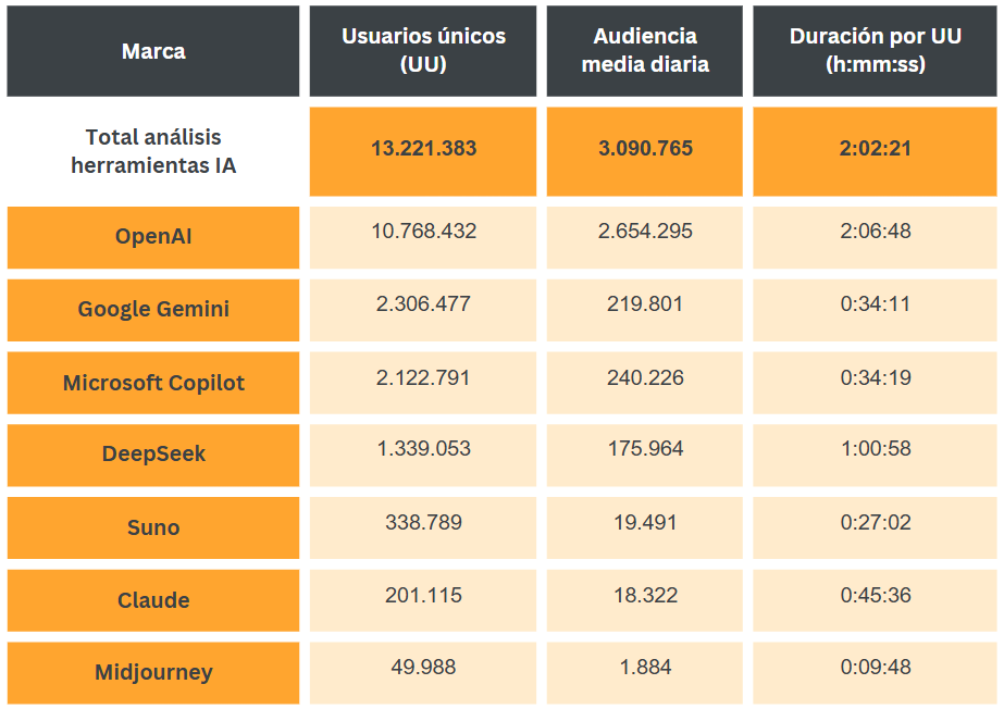 Aunque la distancia con el resto de herramientas es muy elevada, también están atrayendo adeptos otras como Google Gemini, con más de 2,3 millones de visitantes al mes,y Microsoft Copilot, cuya audiencia supera los 2,1 millones de usuarios únicos. Tampoco es desdeñable el ascenso de DeepSeek, que ya alcanza a más de 1,3 millones de personas en nuestro país. Suno, que emplea la IA en la creación de piezas musicales, rebasa los 330.000 usuarios, seguida de Claude (más de 200.000 uu) y Midjourney (cerca de los 50.000).