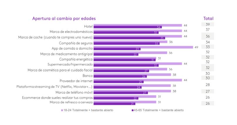 Por edades, los que mayor apertura señalan son los jóvenes de entre 18 y 24 años. Lo primero que cambiarían sería los proveedores de comida a domicilio, y lo que más les costaría cambiar sería la marca de refrescos.