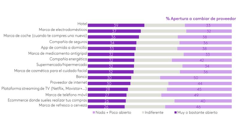Las tres categorías con mayor apertura al cambio son hoteles, electrodomésticos y coches, que tienen en común ser de compra espaciada. Por el contrario, las tres con menos apertura al cambio son refrescos y cervezas, plataformas de eCommerce y dispositivos móviles.