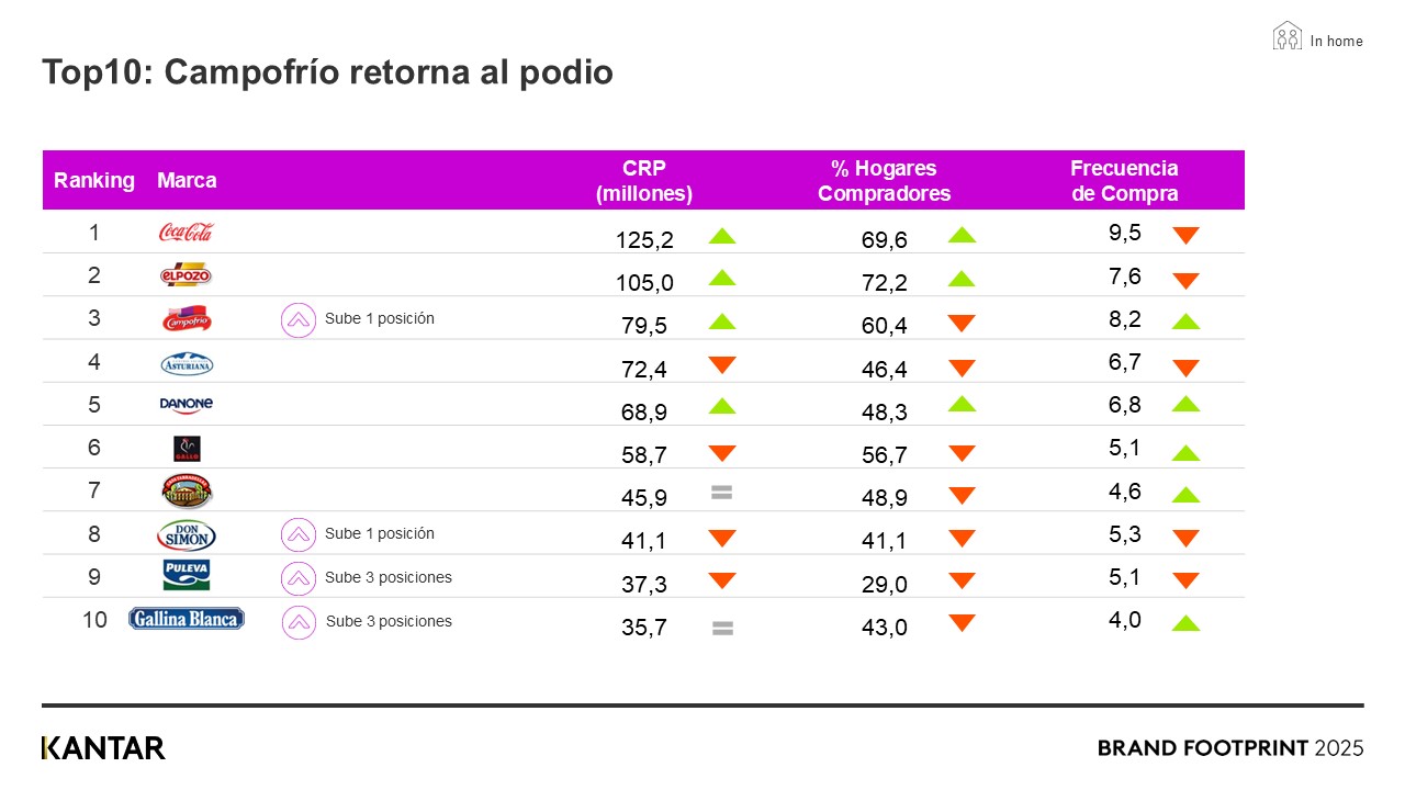 En cifras, Coca-Cola ha obtenido 125,2 millones de contactos con el consumidor, más que ninguna otra marca. Le sigue ElPozo con 105 millones de CRP’s, que es un año más la que entra en más hogares, ya en el 72,2%. Y Campofrío, que ha subido una posición respecto a 2024 y ha vuelto al podio, ha registrado 79,5 millones de contactos.