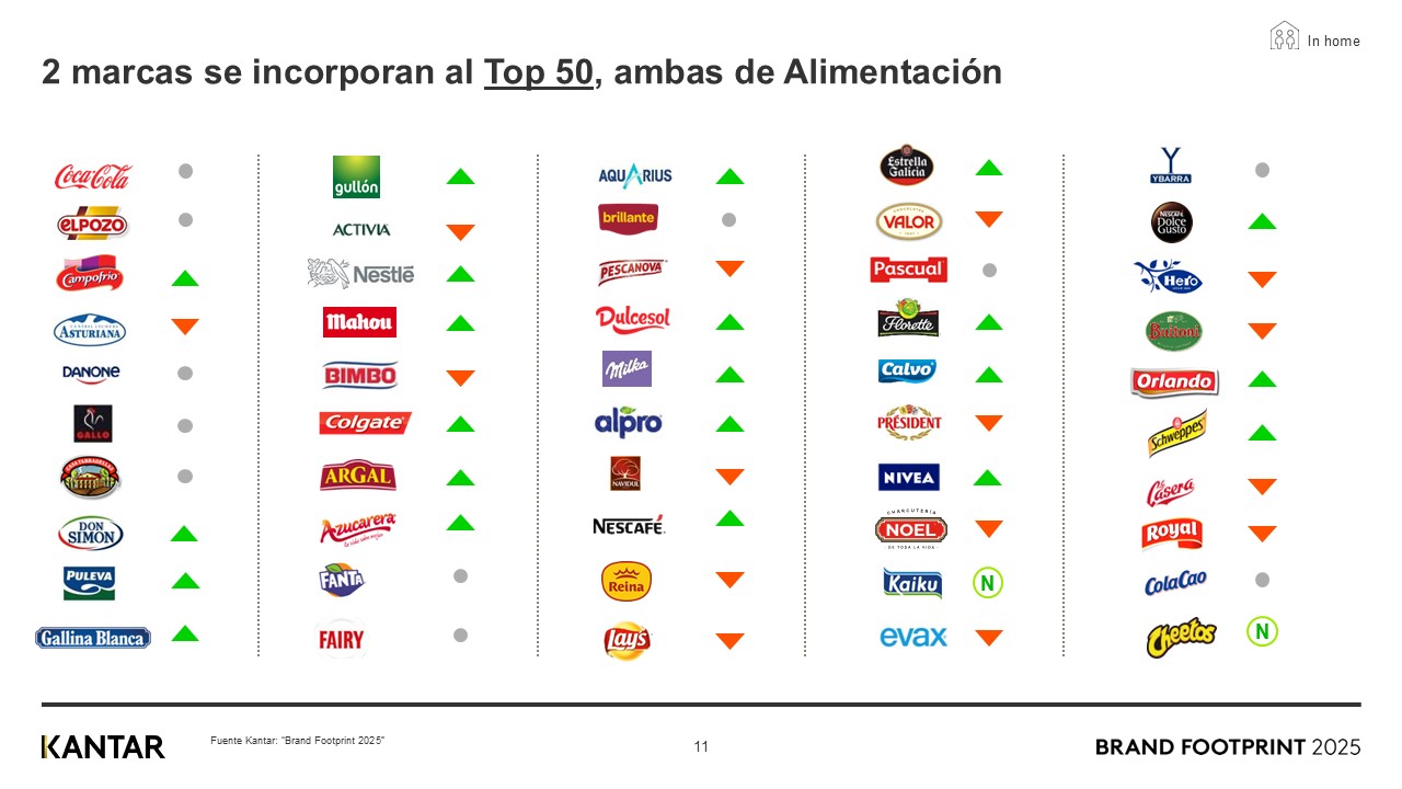 Por sectores y dentro del hogar, no hay cambios en el liderazgo de alimentación (ElPozo); bebidas (Coca-Cola); lácteos + alternativas vegetales (Central Lechera Asturiana); droguería (Fairy); higiene y cuidado personal (Colgate) y frutas y verduras (Plátano de Canarias).