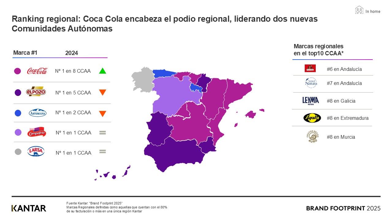 Respecto al ranking por regiones, Coca-Cola es la que lidera más comunidades autónomas, con ocho en total. ElPozo es líder en 5, especialmente en regiones del sur, desde su Murcia natal pasando por Andalucía, Canarias y Extremadura, a la que hay que añadir Navarra.