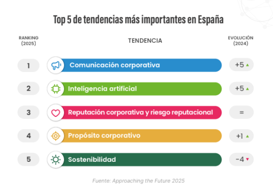 En España, destacan dos tendencias como temas clave en 2025: la comunicación corporativa y la inteligencia artificial emergen como primer y segundo ámbito más importantes, ascendiendo cada uno cinco puestos en el ranking de importancia. Les sigue la reputación corporativa y el riesgo reputacional, que continúan siendo la tercera tendencia más importante para las empresas en España, seguido del propósito corporativo.