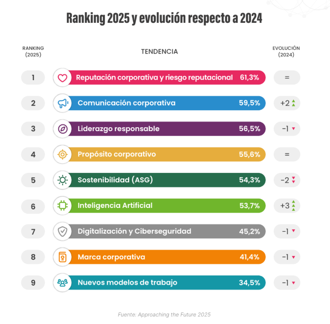 La reputación se reafirma como un activo estratégico esencial para generar valor, construir confianza, mitigar riesgos y fortalecer el posicionamiento de las organizaciones. Junto a ella, destacan en el ranking de prioridades la comunicación corporativa —que sube tres posiciones respecto a 2024—, el propósito empresarial y el liderazgo responsable, como elementos clave en la definición de las estrategias empresariales.