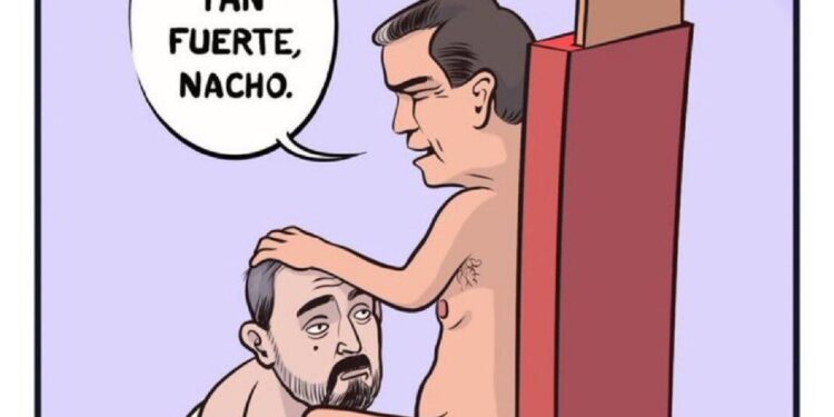 Seguidamente, adjuntó una imagen para darle dónde más duele. “No tan fuerte, Nacho, que se te nota”, apuntó en alusión a la “sumisión” del periodista a Pedro Sánchez. La caricatura, en este caso, no deja lugar a dudas.