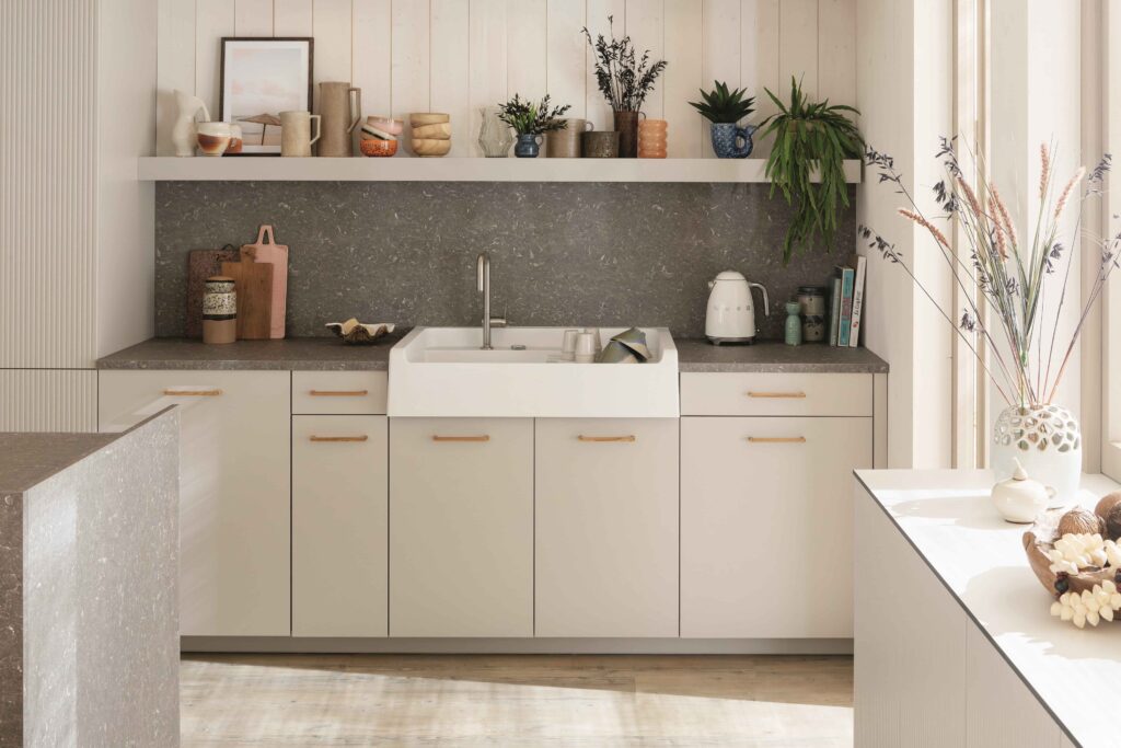 - Encimeras y revestimientos Shell estructurado: materiales con acabado mineral que combinan modernidad, resistencia y facilidad de mantenimiento.