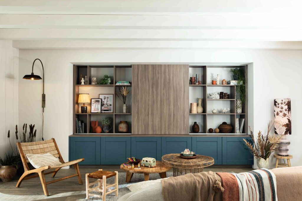 La zona de estar continúa el relato de diseño iniciado en la cocina. Una librería a medida en nogal rubio veneciano y azul pizarra aporta elegancia y funcionalidad. Con un gesto, la televisión desaparece tras paneles correderos, dejando un espacio limpio y sereno que se adapta al ritmo de la vida familiar.
