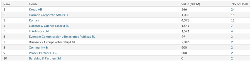 Kreab tiene un amplio conocimiento de los mercados de capitales y del panorama regulatorio y logra una vez más ser la consultora de referencia en España en el campo de la comunicación financiera, al encabezar durante más de diez años consecutivos el ranking de M&A en España.