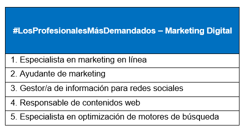 En este sentido, los puestos más ofertados en el sector en la plataforma han sido especialista en marketing en línea, ayudante de marketing, gestor/a para la información de redes sociales, responsable de contenidos web o especialista en optimización de motores de búsqueda.