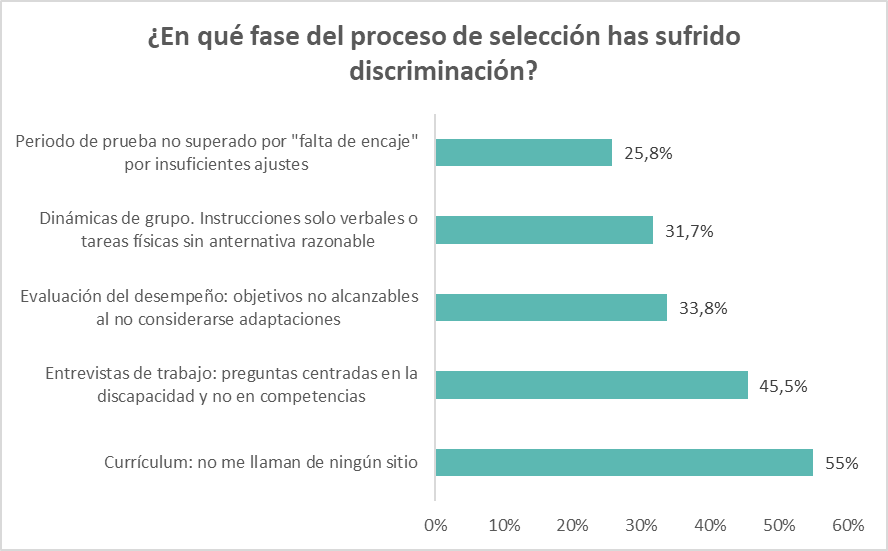 En efecto, el 57% de los jóvenes con discapacidad declara haber sufrido discriminación en su búsqueda de trabajo. El 55% de ellos señala que sus candidaturas son ignoradas -envía su currículum y no recibe respuesta- y el 45,5% afirma que la discriminación se manifiesta en las entrevistas, donde las preguntas tienden a centrarse en su discapacidad y no en sus competencias. Por ejemplo, preguntando sobre ausencias médicas o cuestionando disponibilidad.