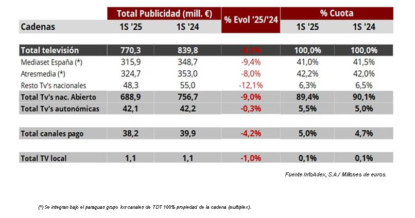 En los seis primeros meses de 2025 ha bajado un -9,0% la inversión publicitaria de las televisiones nacionales en abierto, que ha alcanzado los 688,9 millones de euros, situando su cuota de mercado en el 89,4%. Atresmedia ha alcanzado una cifra de 324,7 millones lo que supone una disminución del -8,0% respecto al mismo período de 2024, situando su cuota en el 42,2%, mientras que Mediaset España, con un decrecimiento del -9,4%, ha alcanzado una cifra de 315,9 millones, habiendo obtenido una cuota de mercado del 41,0%.