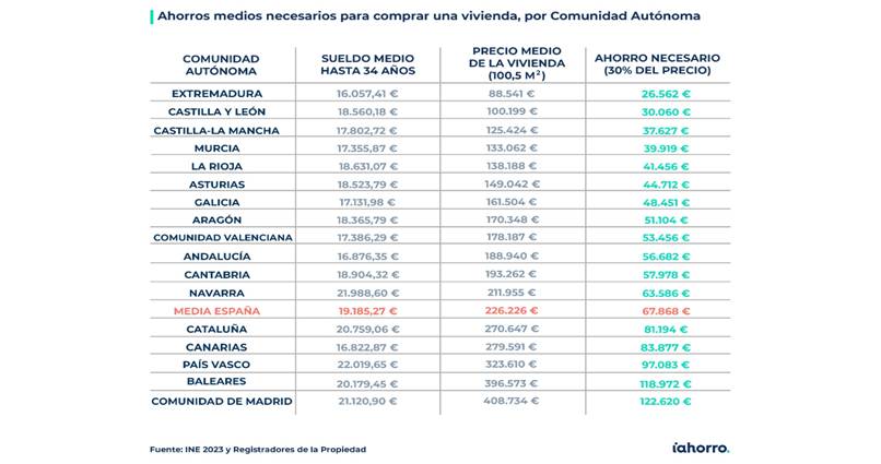 Para hacer estos cálculos, desde el comparador y asesor hipotecario iAhorro hemos tenido en cuenta que las entidades financieras suelen exigir un 30% del precio de la vivienda como ahorro previo (que cubre el 20% que se debe aportar para la entrada y el 10% aproximado para los gastos de compraventa). De este modo, por ejemplo, para una vivienda de 226.226 euros de media se necesitarían unos ahorros totales de 67.868 euros (algo más de 45.000 euros para la entrada y casi 23.000 euros para los gastos) y 17,69 años de ahorro para poder comprarla sin ningún problema.