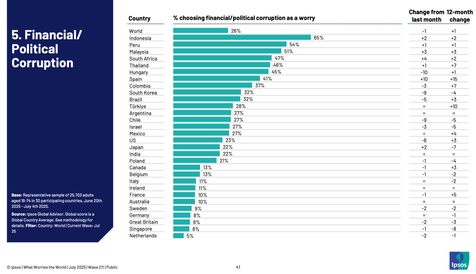 En contraste, en Hungría la preocupación descendió diez puntos en el último mes, ubicándose en el 45%, aunque sigue siendo ligeramente superior al mismo período del año pasado. En el ranking global de preocupación por la corrupción, los primeros lugares corresponden a Indonesia, Perú, Malasia, Sudáfrica, Tailandia, Hungría, España (41%), Colombia, Corea del Sur, Brasil, Turquía y Argentina.