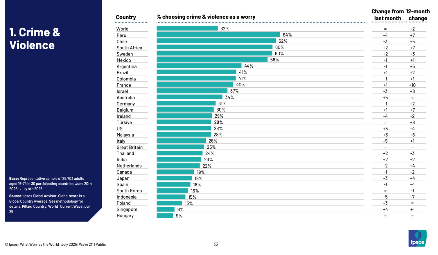 Con un 32%, el crimen y la violencia se posicionan como la principal preocupación global, desplazando a la inflación al segundo lugar (31%). En el ranking mundial, seis países latinoamericanos se encuentran entre los diez más preocupados por el crimen y la violencia.