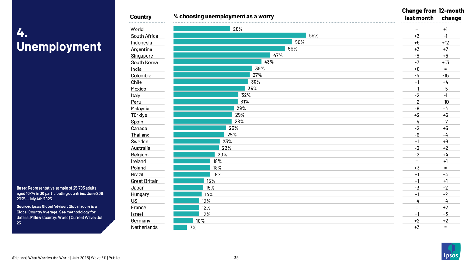 El desempleo se mantiene en el 28% de menciones a nivel global. Sudáfrica continúa liderando como el país más preocupado por la falta de trabajo, con un 65% de ciudadanos mencionando este tema. Indonesia registra niveles récord de preocupación, alcanzando el 58%, lo que significa un aumento de 12 puntos versus julio de 2024.