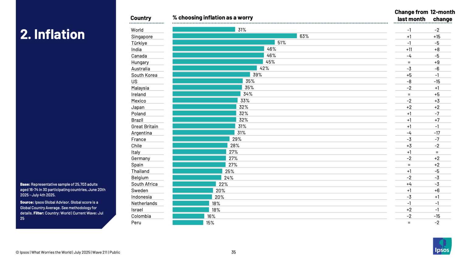 La corrupción preocupa actualmente al 26% de los encuestados en los 30 países analizados, con una caída marginal en comparación con períodos previos. Sin embargo, algunos países registran cambios significativos. En España, la proporción de personas que consideran la corrupción como uno de los principales problemas aumentó diez puntos en comparación con el mes pasado, alcanzando el 41%. Se trata de un nivel 15 puntos superior al registrado en julio de 2024.