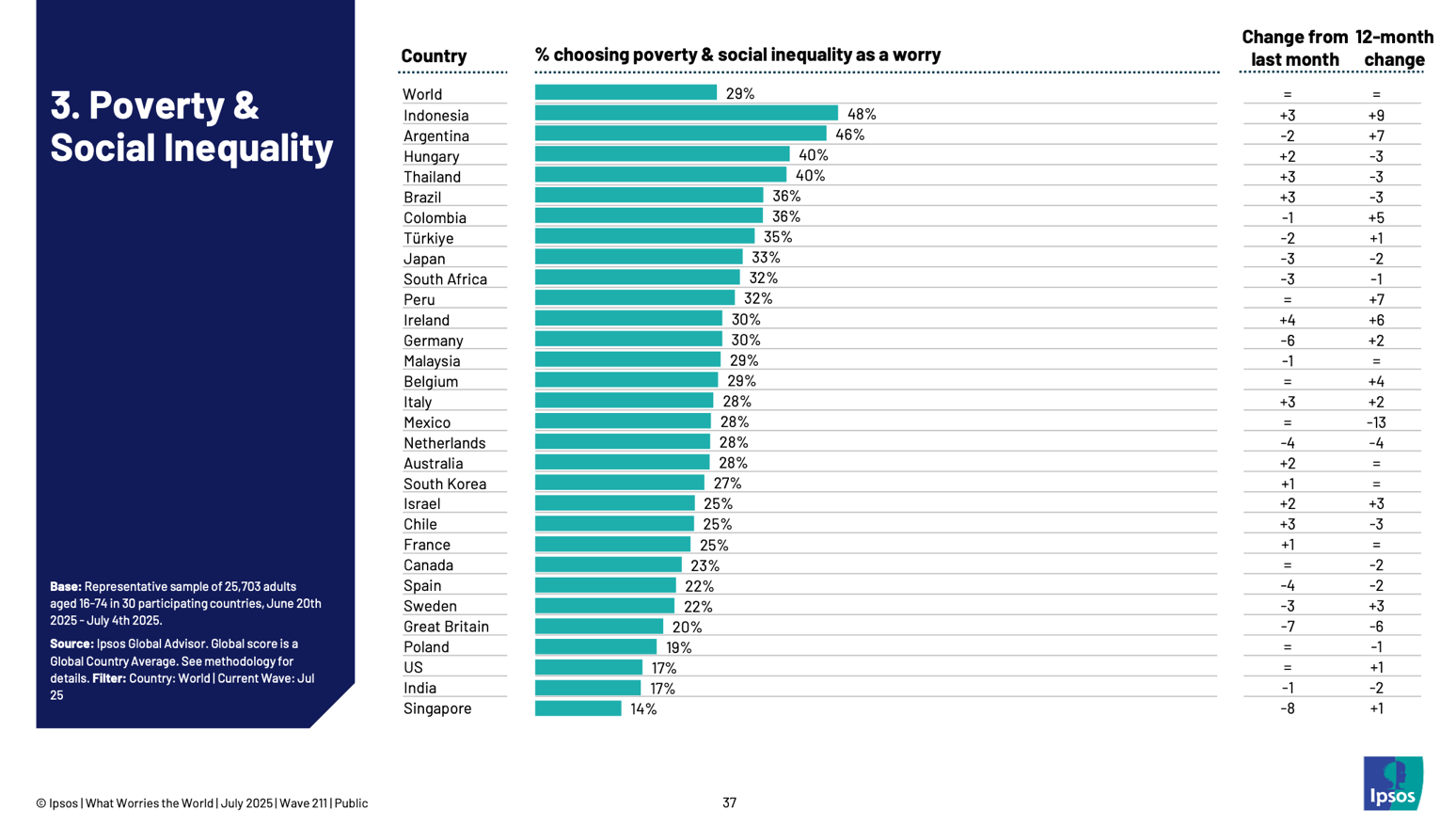 A nivel global, el 29% de los encuestados señala la pobreza y la inequidad social como uno de los principales problemas en sus países. En este punto, América Latina vuelve a tener una fuerte presencia entre los primeros 15. Argentina aparece, después de Indonesia, como el país de LATAM donde más preocupa este tema, con un incremento de 7 puntos en el último año.