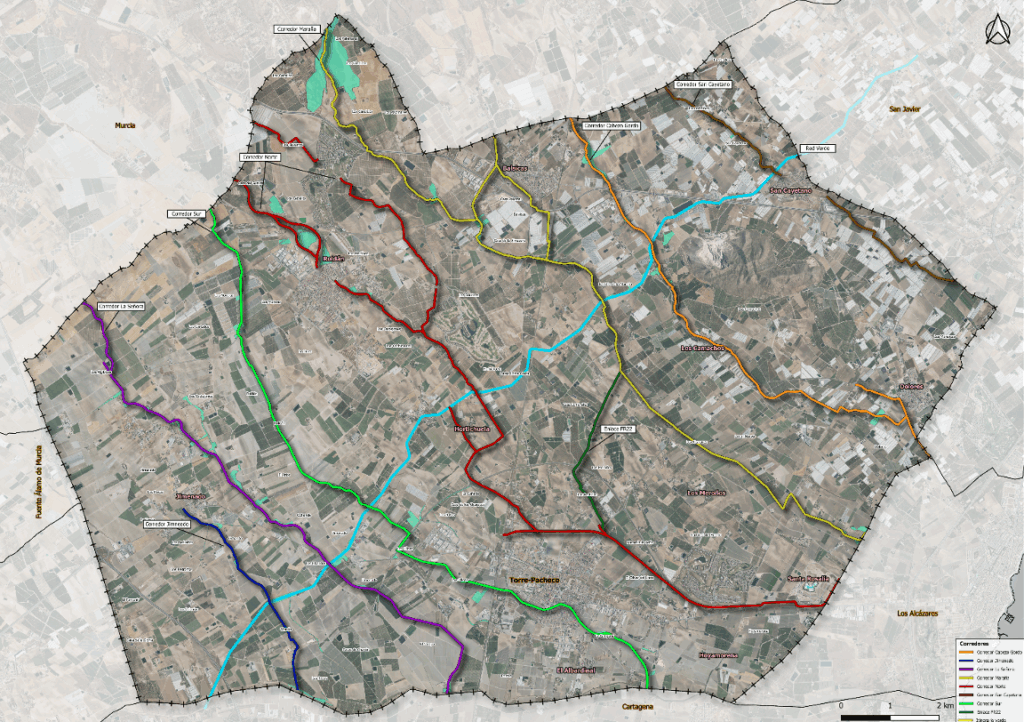 Es importante señalar que el municipio de Torre Pacheco presenta una notable exposición al riego de inundación. En este contexto, la implementación de los corredores ambientales no solo actúa como infraestructura verde para la conectividad ecológica, sino también como una estrategia eficaz de drenaje natural que mejora la infiltración y reduce los volúmenes de agua acumulada aguas abajo.