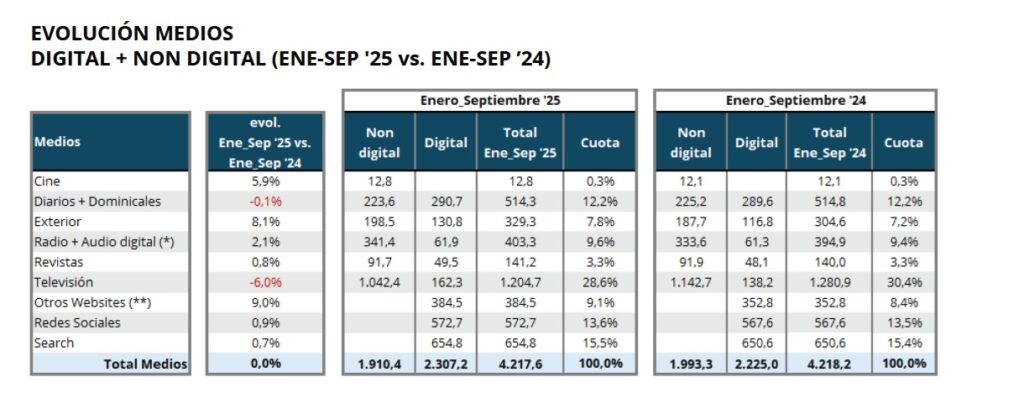 Aumentar su cuota en inversión publicitaria sigue siendo una de las tareas pendientes de Diarios y Dominicales en este estudio. En los nueve primeros meses de 2025 sufre una regresión del 0,1% conformándose con 514,3 millones de euros de inversión publicitaria, a pesar de ser el cuarto medio con mayor cuota (12,2%).