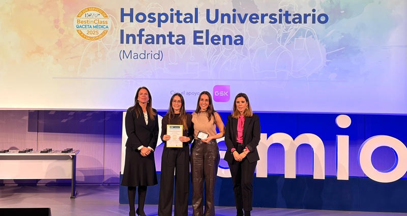 Los reconocimientos, entregados ayer en un acto celebrado en Madrid y al que asistieron numerosos representantes del sector sanitario de nuestro país, fueron recogidos por los jefes de los servicios premiados del centro hospitalario, que estuvieron arropados por Marta del Olmo y el Dr. Jorge Short, gerente territorial y gerente territorial adjunto, respectivamente, del Infanta Elena, así como por la Dra. Adriana Pascual y Laura Alfaro, directora médica y de Calidad del hospital, respectivamente; y la Dra. María Dolores Martín Ríos, jefa corporativa de Medicina Preventiva.
