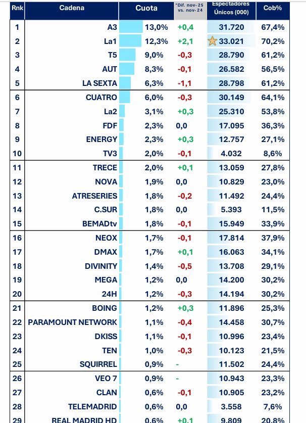 Dentro de las televisiones temáticas, la peor caída del mes se la anota Divinity que pierde medio punto porcentual respecto al noviembre del año pasado y se conforma con una cuota media de 1,4%. Mientras tanto, en este ranking, destacan nombres como Energy, que crece tres décimas hasta situarse como el noveno canal más visto, con una cuota media de 2,3%, superando a TRECE, que se conforma con promediar un 2% de share.