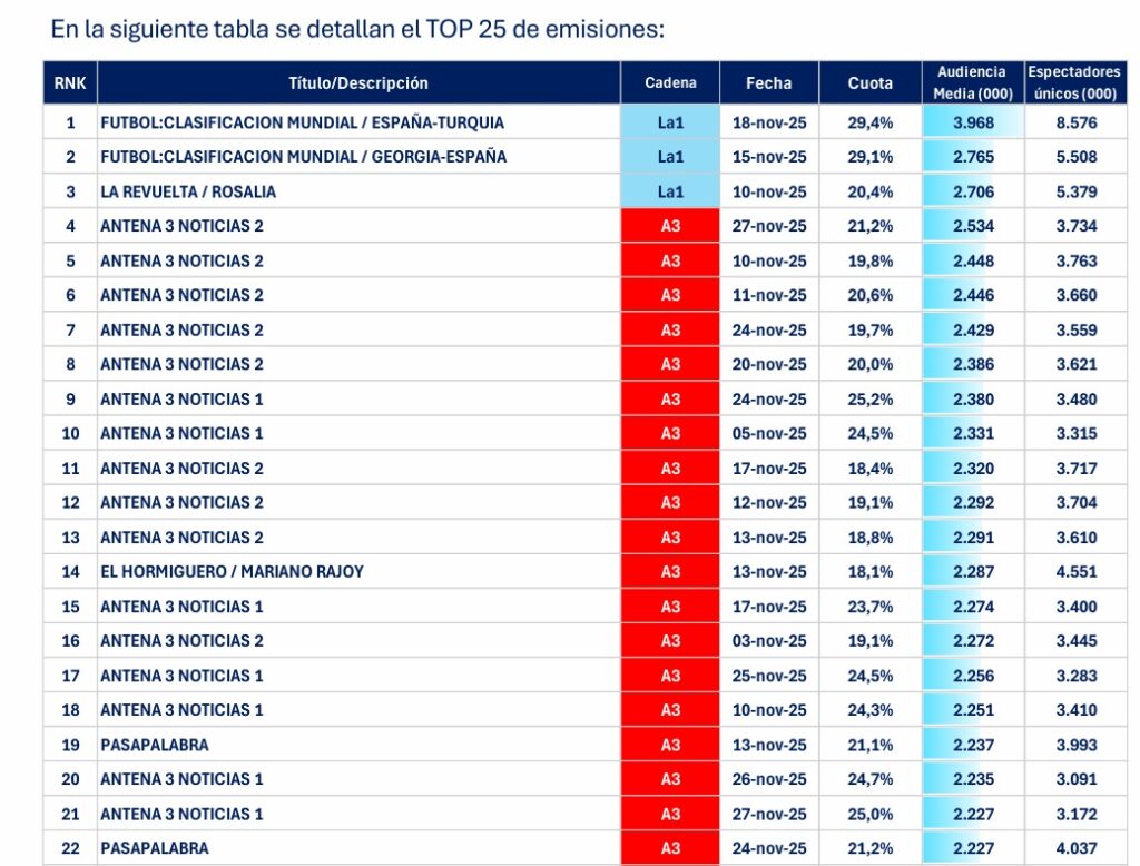 Los tres primeros puestos de este ranking son para La 1 que, gracias al fútbol y a la selección española (España-Turquía y Georgia-España) y al programa de La Revuelta con Rosalía como invitada.