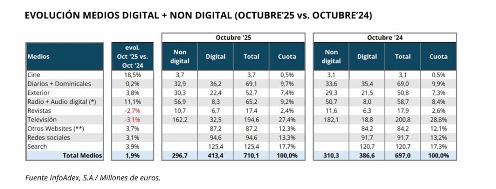 El último informe de Infoadex corrobora que la recta final del año promete un importante ascenso de las cifras, empezando por octubre. En este mes, la inversión publicitaria ha protagonizado un crecimiento del 1,9% más que en el mismo mes de 2024, hasta alcanzar los 710,1 millones de euros.