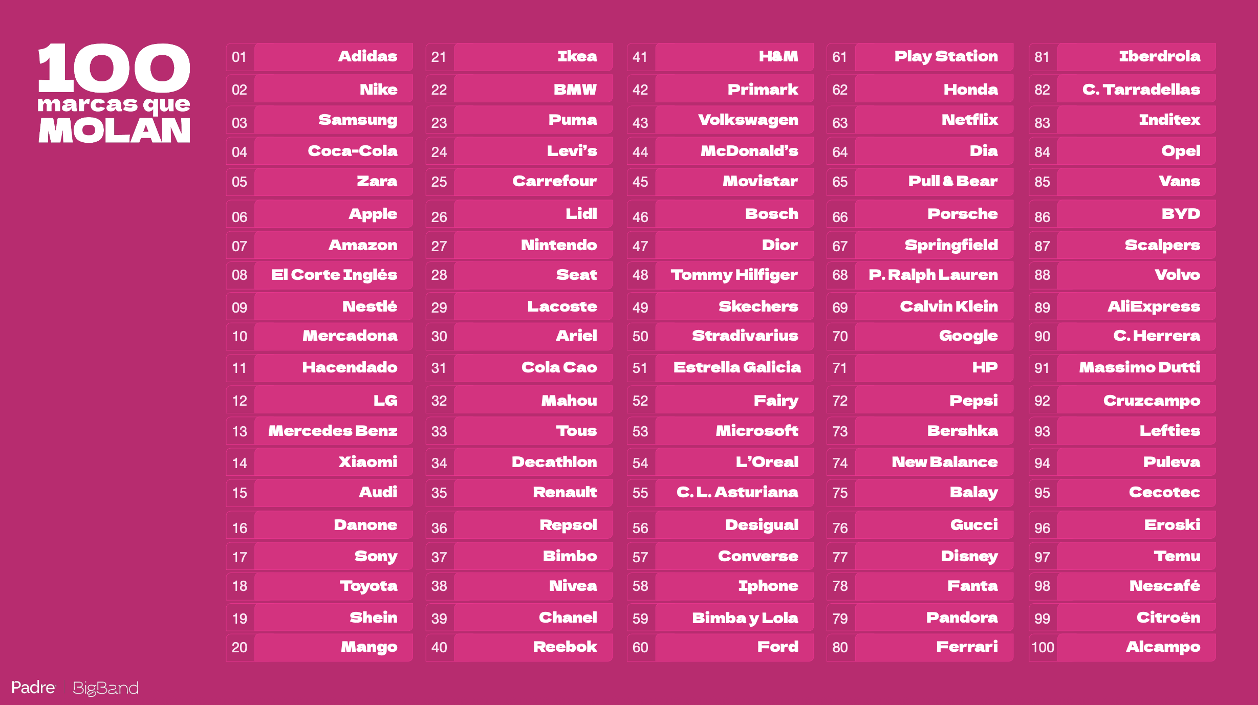 Según los datos del ranking, las 100 Marcas que más Molan en España en 2025 son:
