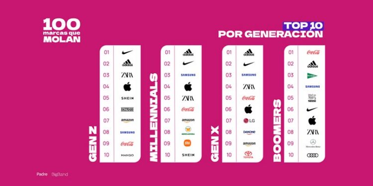 Basándose en una encuesta cuantitativa, con 1.039 casos representativos de diferentes generaciones (Gen Z, Millennials, Gen X y Boomers) residentes en España, complementada con entrevistas en profundidad a expertos del sector y entrevistas a pie de calle, el estudio, que se ha desarrollado a lo largo de un año, concluye con un ranking de las 100 marcas que más molan a los consumidores de nuestro país.