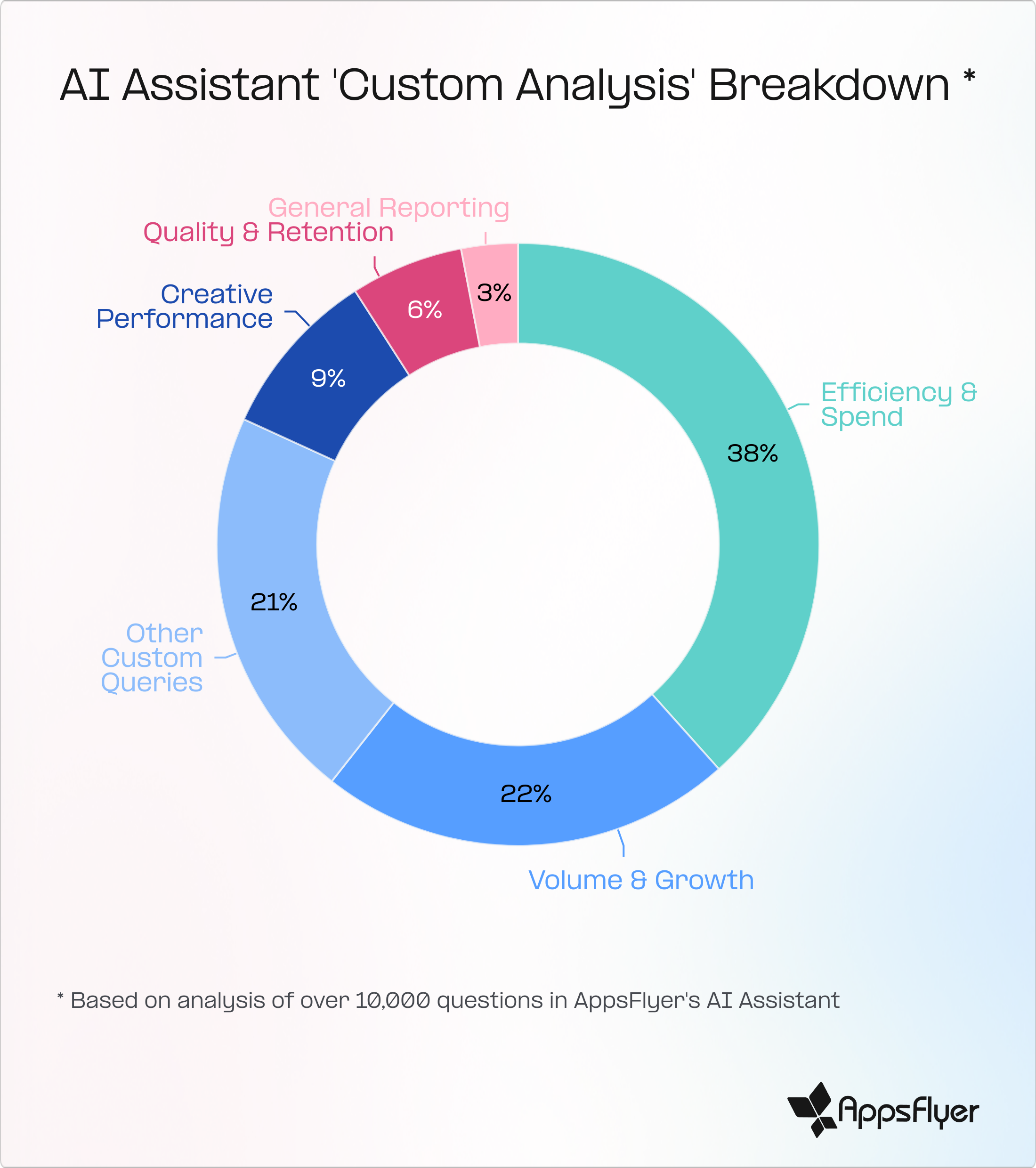 Por primera vez, AppsFlyer también analizó el uso de agentes de IA, identificando cómo los marketers integran la IA en sus flujos de performance marketing. Los datos muestran que el 57% de los despliegues de agentes se centraron en la automatización técnica, como configuración y comprobaciones de integridad de datos, mientras que el 32% apoyó la optimización del negocio.