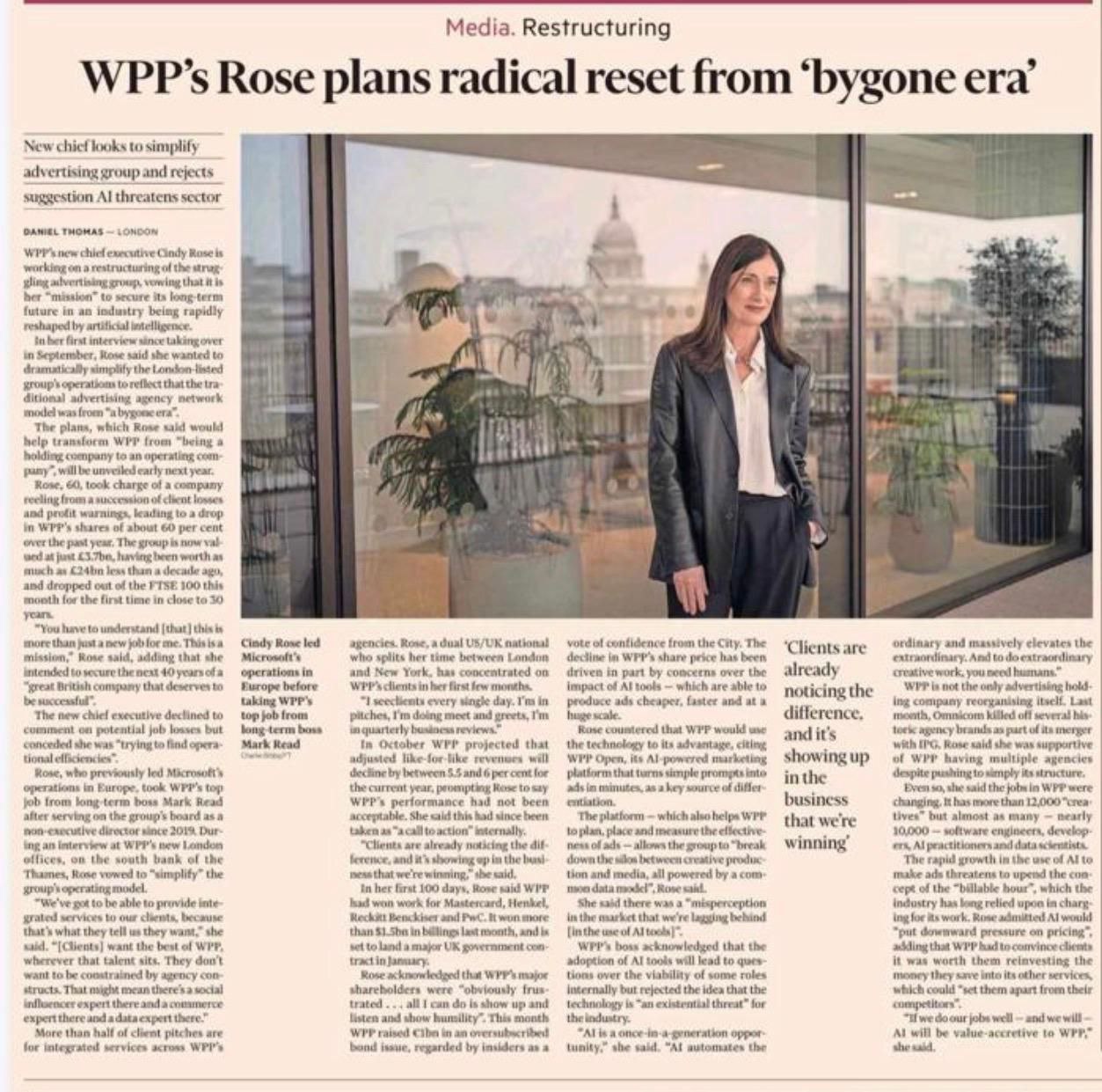 En una entrevista extensa en el Financial Times de este sábado, la nueva consejera delegada global de WPP, Cindy Rose, anuncia un reinicio radical del grupo con el objetivo de dejar atrás lo que define como una “era pasada” del negocio publicitario. Su planteamiento parte de una autocrítica clara: el modelo histórico de grandes holdings complejos, fragmentados y construidos a base de adquisiciones ya no responde a las necesidades actuales de los clientes.