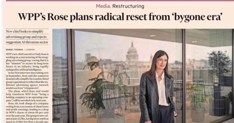 En una entrevista extensa en el Financial Times de este sábado, la nueva consejera delegada global de WPP, Cindy Rose, anuncia un reinicio radical del grupo con el objetivo de dejar atrás lo que define como una “era pasada” del negocio publicitario. Su planteamiento parte de una autocrítica clara: el modelo histórico de grandes holdings complejos, fragmentados y construidos a base de adquisiciones ya no responde a las necesidades actuales de los clientes.