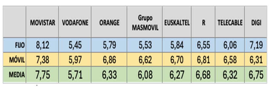 En el extremo contrario, Vodafone con 2,96. Los operadores bajo la órbita de la fusión Másmovil y Orange (estos y Euskaltel, R y Telecable) se sitúan en 1,38. Por último, Movistar registra 1,15. En atención al cliente las quejas de los usuarios sitúan a R como el mejor operador con un volumen de 0,021 por 10.000 abonados. Por debajo del 0,1 se encuentran Digi, Euskaltel, Orange y Movistar. Vodafone presenta un volumen de 0,13 y Másmóvil un 0,15 por cada 10.000 abonados.