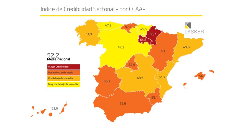 El análisis por comunidades autónomas del Índice Lasker muestra también diferencias territoriales muy significativas, con una brecha de más de 21 puntos entre la región con mayor credibilidad y la que presenta el nivel más bajo. Sin embargo, el mapa autonómico no responde a una división clásica por riqueza, tamaño o peso industrial. Comunidades con fuerte actividad económica no necesariamente obtienen mejores resultados, y territorios más pequeños o menos poblados lideran el índice.