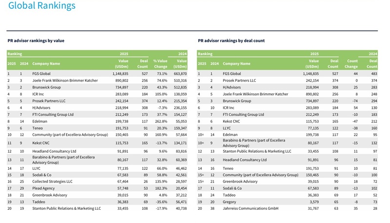 Cabe destacar, asimismo, el papel de FGS Global, consultora internacional de comunicación estratégica con la que LLYC mantiene una alianza y colabora de forma recurrente en operaciones de M&A de carácter transfronterizo. De acuerdo con las league tables oficiales de Mergermarket, FGS Global cerró 2025 como líder mundial en asesoramiento en M&A, ocupando la primera posición por volumen de operaciones anunciadas, con un total de 527 transacciones y un importe agregado de 1.148.835 millones de dólares.